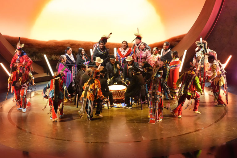 Speváci a tanečníci skupiny Osage vystupujú počas 96. ročníka udeľovania cien americkej Akadémie filmových umení a vied (Oscar 2024). Los Angeles (Dolby Theatre), 10. marec 2024. Foto: SITA/AP.