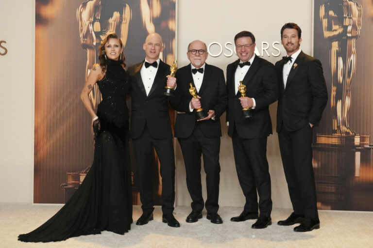 Zľava: Miley Cyrus, Gareth John, Richard King, Ron Bartlett a Miles Teller na udeľovaní cien Oscar 2025. Foto: Jordan Strauss/Invision/AP