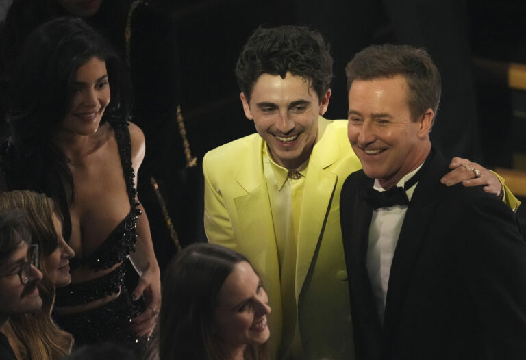 Zľava: Kylie Jenner, Timothee Chalamet a Edward Norton na udeľovaní cien Oscar 2025. Foto: SITA/AP