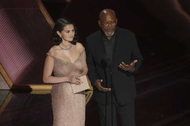 Selena Gomez a Samuel L. Jackson prezentujú cenu za najlepší krátky dokumentárny film na 97. ročníku udeľovania cien Oscar. Foto: SITA/AP