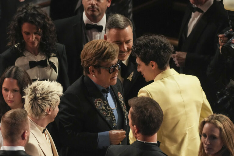 Elton John (naľavo) a Timothee Chalamet na udeľovaní Oscarov 2025. Foto: AP Photo/Chris Pizzello