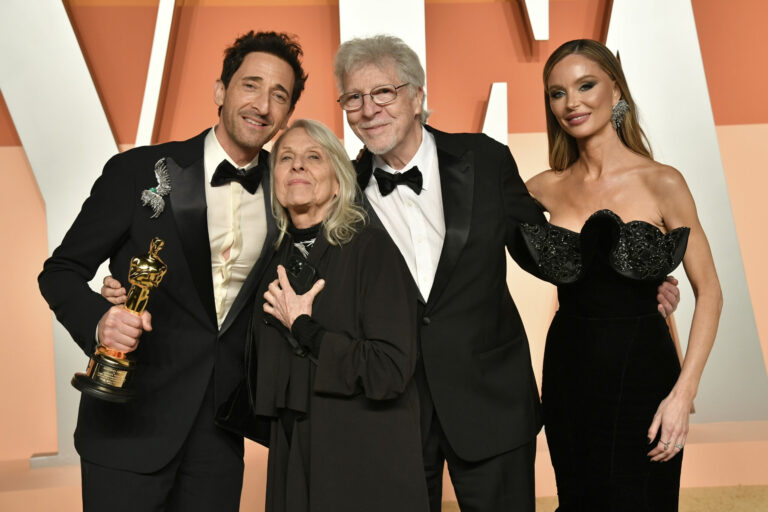 Zľava: Adrien Brody, Sylvia Plachy, Elliot Brody a Georgina Chapman na udeľovaní cien Oscar 2025. Foto: Evan Agostini/Invision/AP