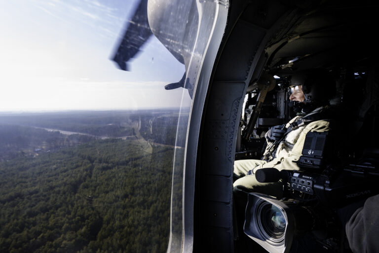 Príslušník Ozbrojených síl SR v helikoptére počas ukážky zásahu bezpečnostných zložiek pri monitorovaní a ochrane kritickej infraštruktúry v rámci operácie Iron Stream pri leteckej základni Kuchyňa. Kuchyňa, 11. február 2025. Foto: SITA/Milan Illík