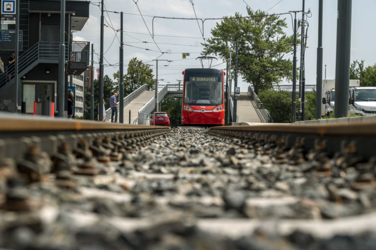 Električka na zastávke Zlaté piesky v Bratislave počas ukončenia Projektu opravy trate a modernizácie zastávok Vajnorskej radiály. Bratislava, 26. jún 2024. Foto: SITA/Milan Illík
