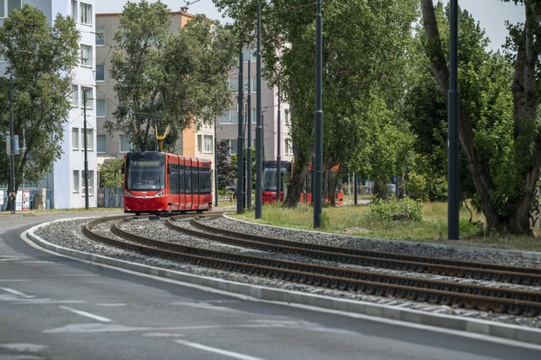 Električky na trati neďaleko zastávky Zlaté piesky v Bratislave počas ukončenia Projektu opravy trate a modernizácie zastávok Vajnorskej radiály. Bratislava, 26. jún 2024. Foto: SITA/Milan Illík