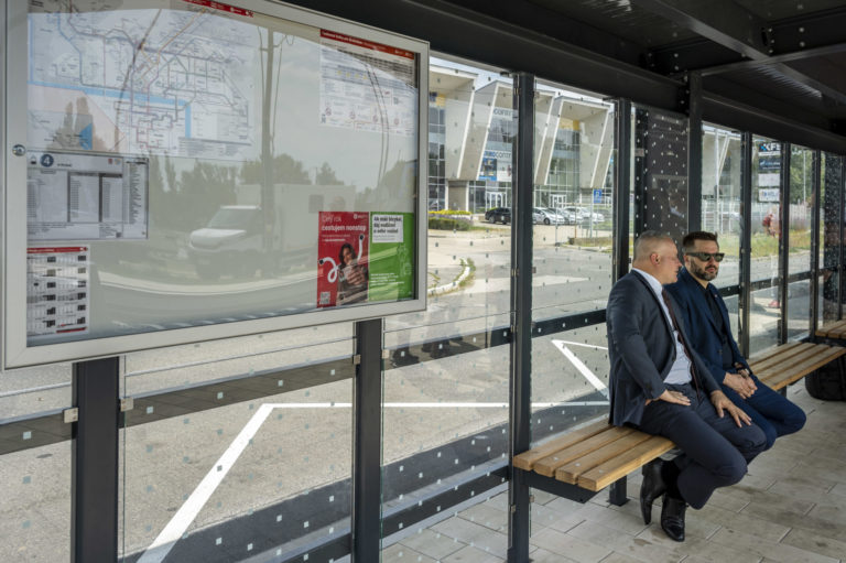Zľava: Predseda Bratislavského samosprávneho kraja (BSK) Juraj Droba a primátor Bratislavy Matúš Vallo sedia na zastávke Zlaté piesky v Bratislave v rámci ukončenia Projektu opravy trate a modernizácie zastávok Vajnorskej radiály. Bratislava, 26. jún 2024. Foto: SITA/Milan Illík