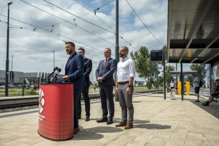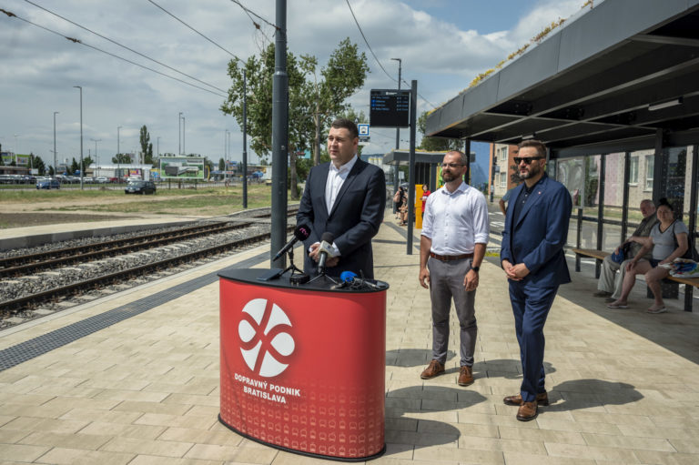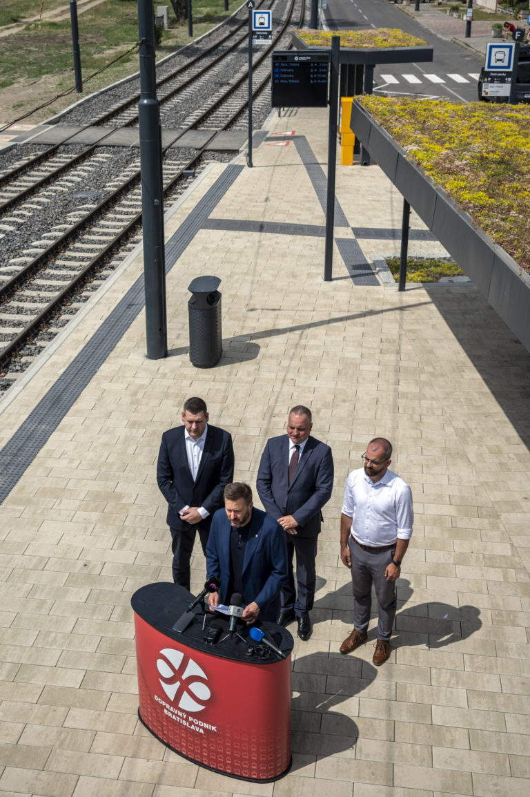 Brífing k ukončeniu Projektu opravy trate a modernizácie zastávok Vajnorskej radiály na električkovej zastávke Zlaté piesky v Bratislave. Bratislava, 26. jún 2024. Foto: SITA/Milan Illík