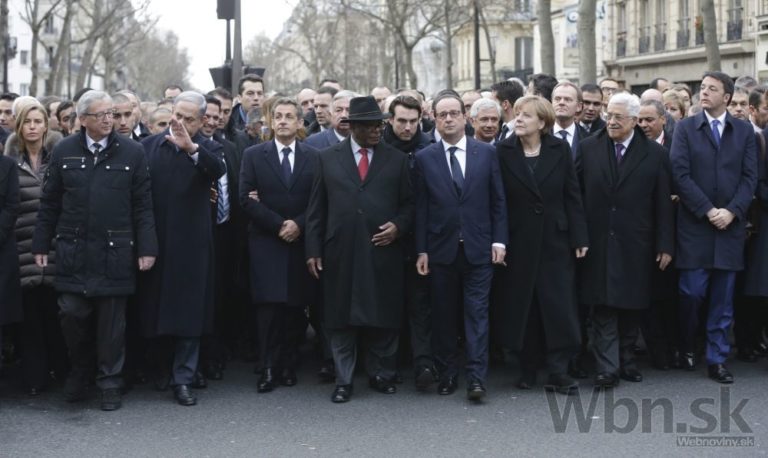 Na čele davu stoja viacerí európski lídri. Zľava: Predseda Európskej komisie Jean-Claude Juncker, izraelský premiér Benjamin Netanyahu, bývalý francúzsky prezident Nicolas Sarkozy, prezident Mali Ibrahim Boubacar Keita, francúzsky prezident Francois Hollande, nemecká kancelárka Angela Merkelová, prezident EÚ Donald Tusk, prezident Palestínskeho štátu Mahmoud Abbas a taliansky premiér Matteo Renzi. Foto: SITA/AP