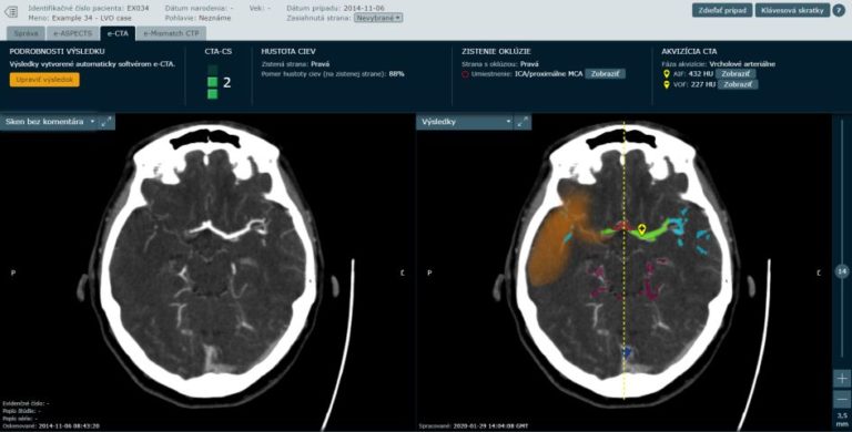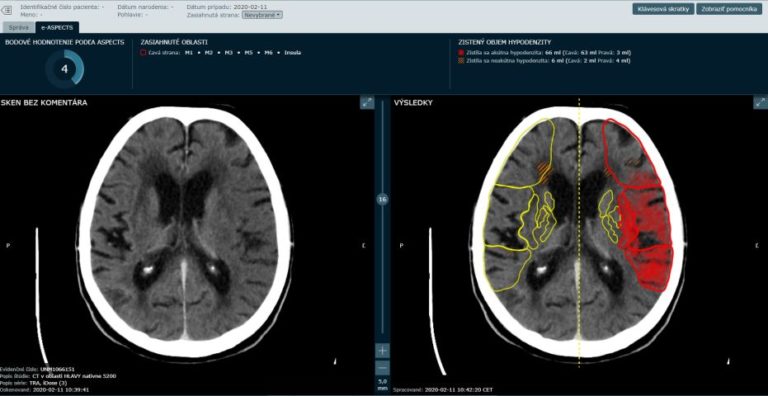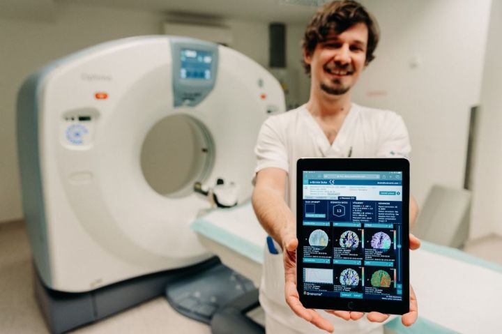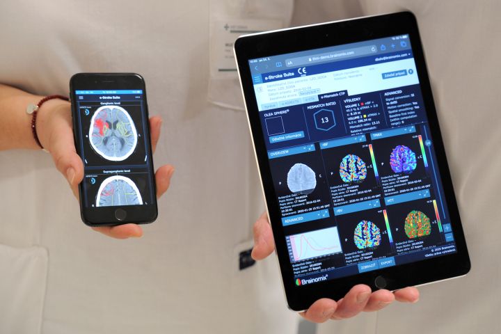Primár neurologického oddelenia Nemocnice Svet zdravia v Galante Oto Petrík (vľavo) počas predstavenia systému umelej inteligencie Brainomix za účasti manažmentu siete nemocníc Svet zdravia, galantskej nemocnice, predstaviteľa spoločnosti Brainomix a primára neurologického a rádiologického oddelenia v galantskej nemocnici. Foto: SITA/Martin Havran
