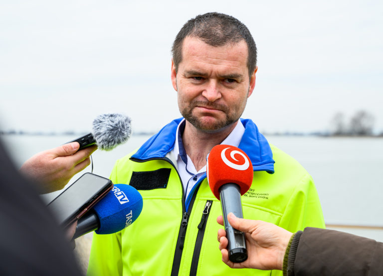 Námestník riaditeľa Povodia dolného Váhu Stanislav Bilčík počas tlačového brífingu Štátnej ochrany prírody spojeného s obhliadkou plávajúceho umelého vtáčieho ostrova a jeho umiestnenia na vodnú nádrž Sĺňava v prístave Ratnovce pri príležitosti Svetového dňa vody. Ratnovce, 22. marec 2023. Foto: SITA/Martin Havran.