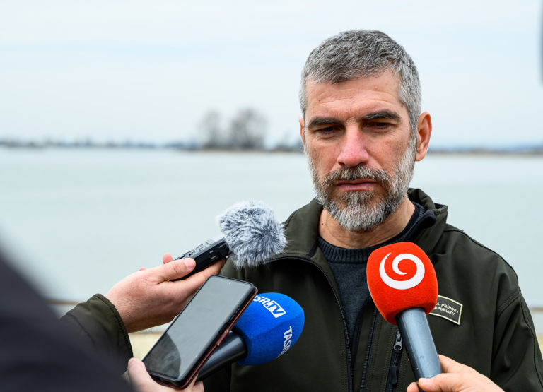 Riaditeľ Správy CHKO Malé Karpaty ŠOP SR Peter Puchala počas tlačového brífingu Štátnej ochrany prírody spojeného s obhliadkou plávajúceho umelého vtáčieho ostrova a jeho umiestnenia na vodnú nádrž Sĺňava v prístave Ratnovce pri príležitosti Svetového dňa vody. Ratnovce, 22. marec 2023. Foto: SITA/Martin Havran.