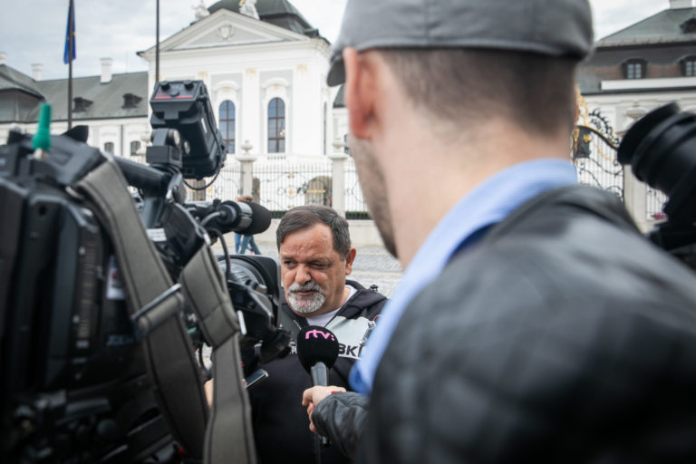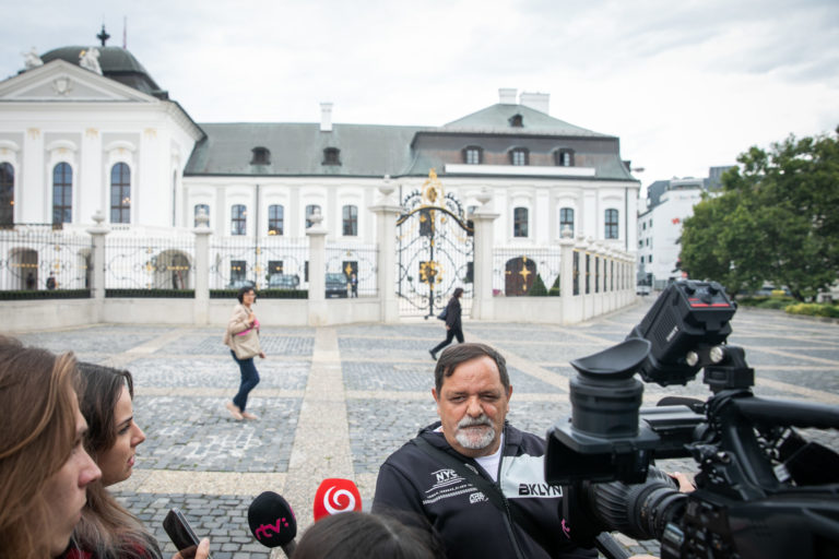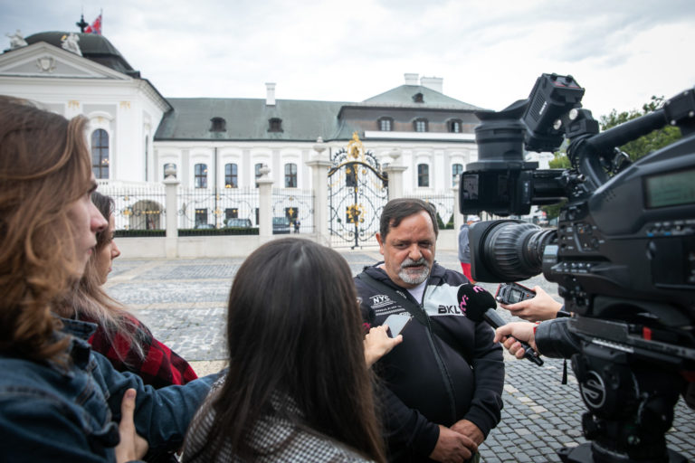 Predseda OZ Únia Rómov na Slovensku František Tanko (vpravo) počas brífingu na tému: Billboardy Mariana Kotlebu s rasistickým podtónom, pred Prezidentským palácom. Bratislava, 9. august 2023. Foto: SITA/Diana Černak