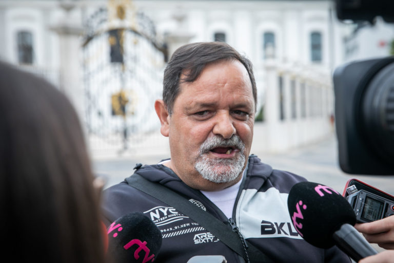 Predseda OZ Únia Rómov na Slovensku František Tanko počas brífingu na tému: Billboardy Mariana Kotlebu s rasistickým podtónom, pred Prezidentským palácom. Bratislava, 9. august 2023. Foto: SITA/Diana Černak