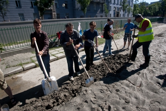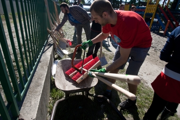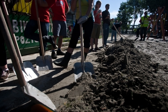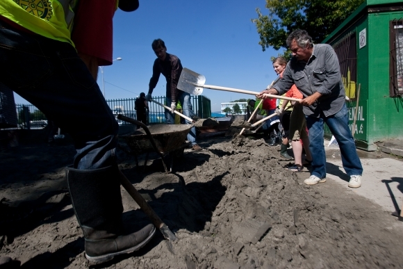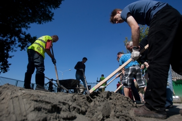 Dobrovoľníci upratujú detské ihrisko na Fajnorovom nábreží po povodni. Bratislava, 13. jún 2013. Foto: SITA/Gabriel Kuchta
