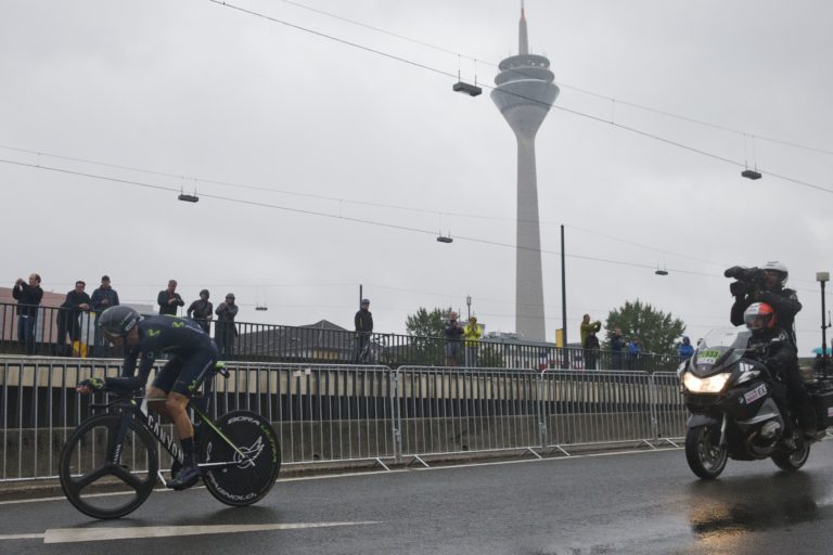 Španielsky cyklista Alejandro Valverde z tímu Movistar počas úvodnej etapy 104. ročníka Tour de France, ktorou bola časovka na 14 kilometrov. Düsseldorf , 1. júl 2017. Foto: SITA/AP.