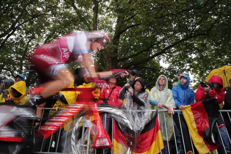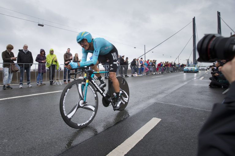 Kazašský cyklista Andrey Zeits počas úvodnej etapy 104. ročníka Tour de France, ktorou bola časovka na 14 kilometrov. Düsseldorf , 1. júl 2017. Foto: SITA/AP.