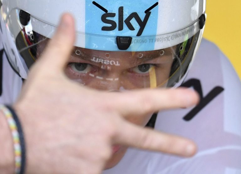 Britský cyklista Christopher Froome z tímu Sky na štarte úvodnej etapy 104. ročníka Tour de France, ktorou bola časovka na 14 kilometrov. Düsseldorf , 1. júl 2017. Foto: Bernd Thissen/dpa via AP.