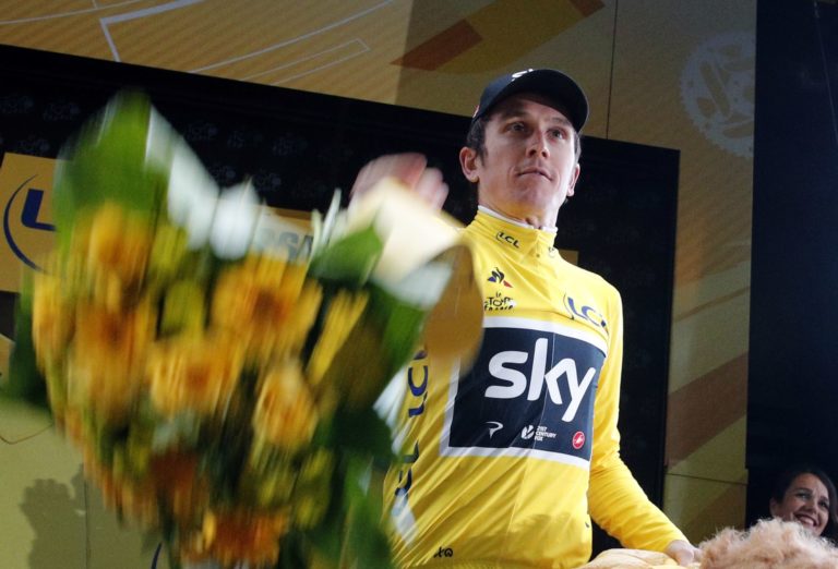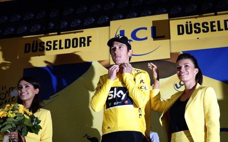 Britský cyklista Geraint Thomas na stupňoch pre víťazov po úvodnej etape 104. ročníka Tour de France, ktorou bola časovka na 14 kilometrov. Düsseldorf , 1. júl 2017. Foto: SITA/AP.