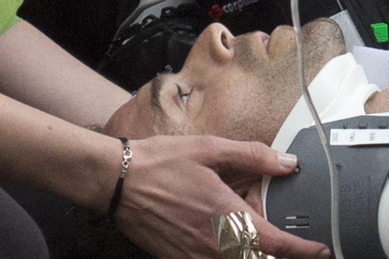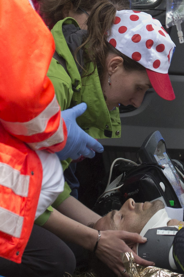 Ošetrovaný španielsky cyklista Alejandro Valverde z tímu Movistar po jeho páde v úvodnej časovke 104. ročníka Tour de France, ktorou bola časovka na 14 kilometrov. Düsseldorf , 1. júl 2017. Foto: SITA/AP.