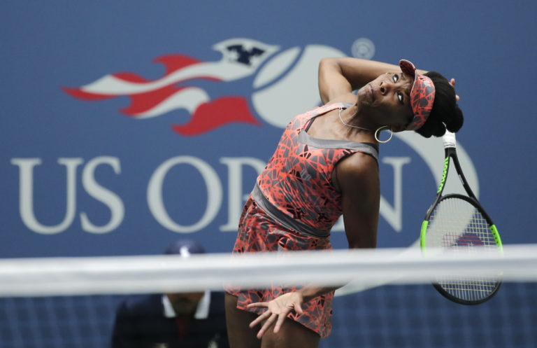 Američanka Venus Williamsová počas zápasu 1. kola US Open proti Slovenke Viktórii Kužmovej, ktorú zdolala 6:3, 3:6, 6:2. New York, 28. august 2017. Foto: SITA/AP
