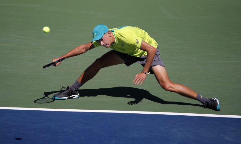 Austrálsky tenista Alex de Minaur počas zápasu úvodného kola US Open, v ktorom podľahol Rakúšanovi Dominicovi Thiemovi 4:6, 1:6, 1:6. New York, 30. august 2017. Foto: SITA/AP.