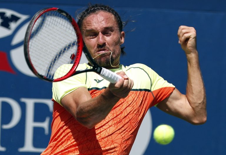 Ukrajinský tenista Alexandr Dolgopolov počas zápasu úvodného kola US Open, v ktorom zdolal Nemca Jana-Lennarda Struffa 3:6, 6:3, 6:2, 1:6, 6:3. New York, 30. august 2017. Foto: SITA/AP.