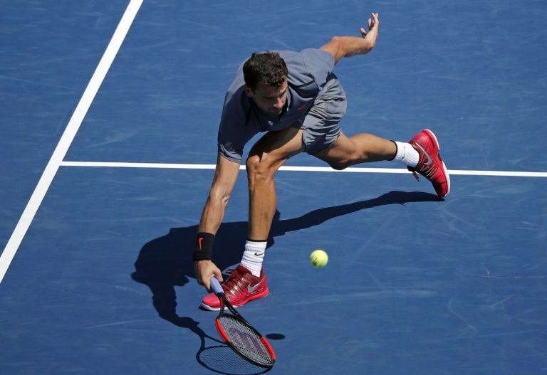 Bulharský tenista Grigor Dimitrov počas zápasu úvodného kola US Open, v ktorom zdolal Čecha Václava Šafránka 6:1, 6:4, 6:2. New York, 30. august 2017. Foto: SITA/AP.