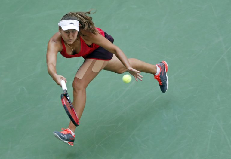 Ruská tenistka Jevgenija Rodinová počas zápasu úvodného kola US Open, v ktorom zdolala Kanaďanku Eugenie Bouchardovú 7:6 (2), 6:1. New York, 30. august 2017. Foto: SITA/AP.