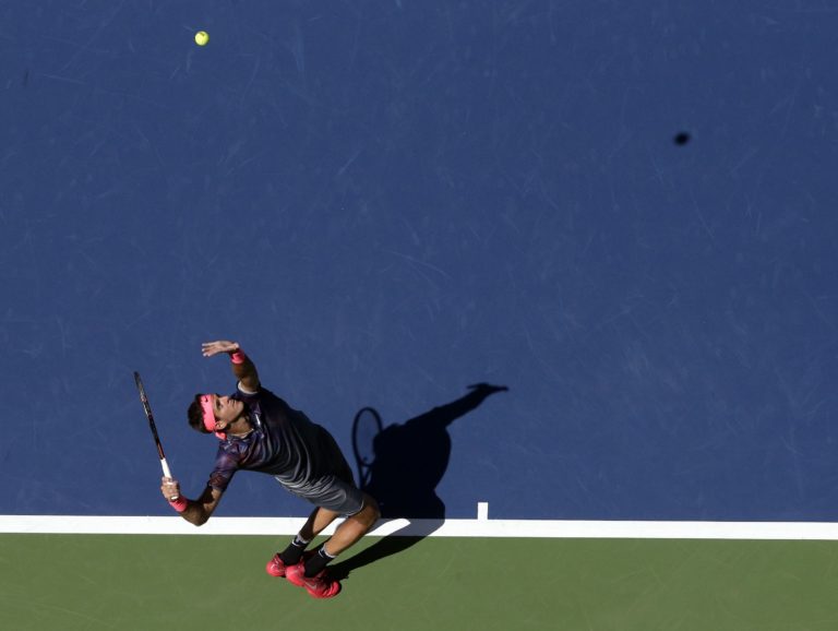 Argentínsky tenista Juan Martin del Potro počas zápasu úvodného kola US Open, v ktorom zdolal Švajčiara Henriho Laaksonena 6:4, 7:6 (3), 7:6 (5). New York, 30. august 2017. Foto: SITA/AP.