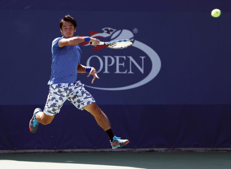 Japonský tenista Juiči Sugita počas zápasu úvodného kola US Open, v ktorom zdolal Francúza Geoffreya Blancaneauxa 6:2, 6:2, 6:0. New York, 30. august 2017. Foto: SITA/AP.