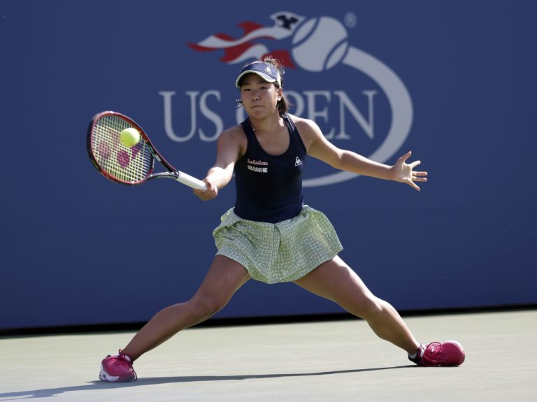 Japonská tenistka Nao Hibinová počas zápasu úvodného kola US Open, v ktorom zdolala Catherine Bellisovú 6:3, 4:6, 7:5. New York, 30. august 2017. Foto: SITA/AP.