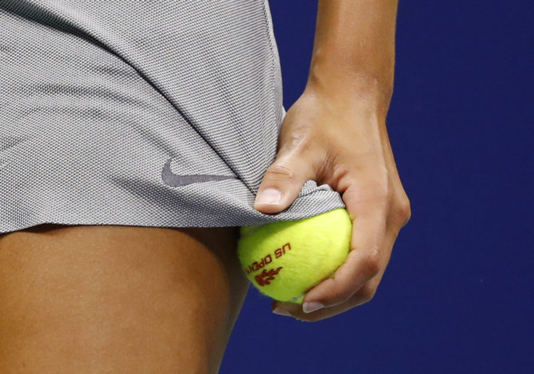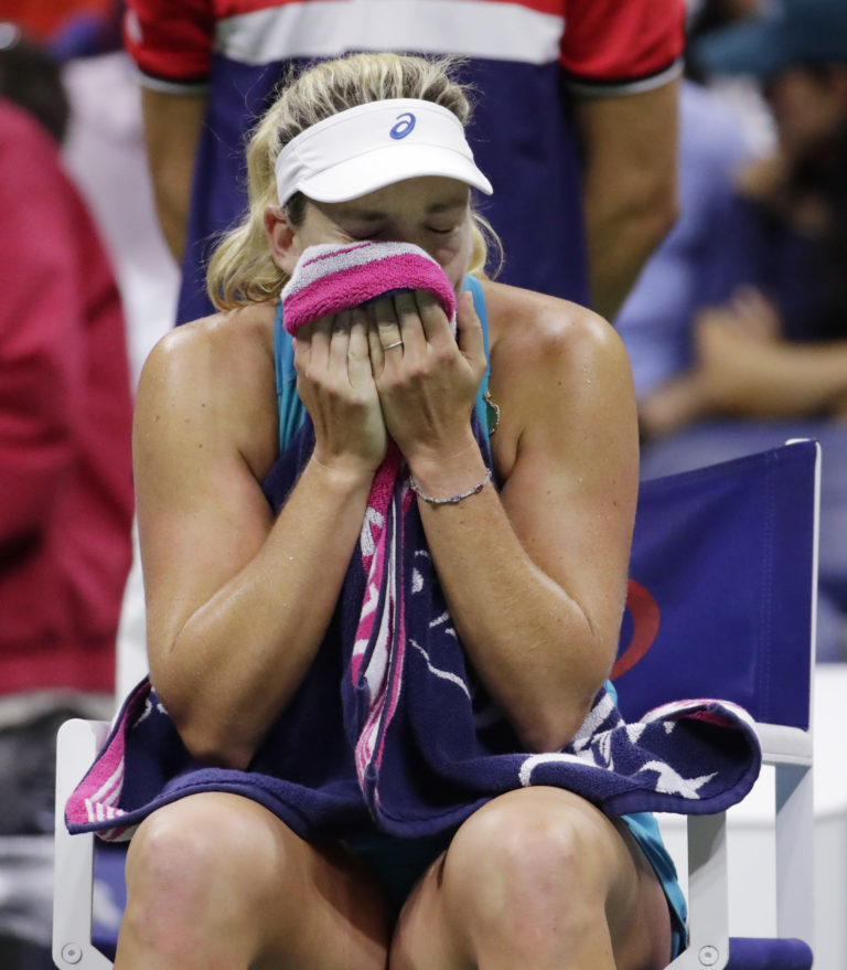 CoCo Vandeweghe, of the United States, wipes sweat from her face during a break in play against Madison Keys, of the United States, during the semifinals of the U.S. Open tennis tournament, Thursday, Sept. 7, 2017, in New York. (AP Photo/Julio Cortez) Foto: SITA/AP.