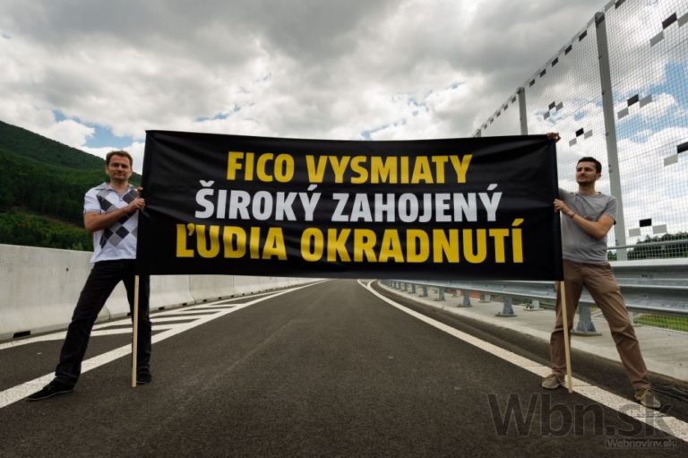 Predseda strany OĽaNO Igor Matovič (vľavo) s protestným transparentom počas slávnostného otvorenia úseku diaľnice D1 Dubná skala - Turany. Vrútky, 10. júl 2015. Foto: SITA/Milo Fabian