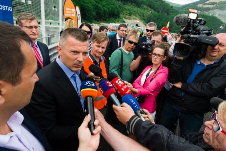 Minister dopravy, výstavby a regionálneho rozvoja SR Ján Počiatek (druhý zľava) počas brífingu pri príležitosti slávnostného otvorenia úseku diaľnice D1 Dubná skala - Turany. Vrútky, 10. júl 2015. Foto: SITA/Milo Fabian