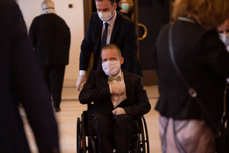 Najmladší poslanec Národnej rady SR za hnutie OBYČAJNÍ ¼UDIA a nezávislé osobnosti (O¼ANO) Dominik Drdul (v popredí) pred začiatkom ustanovujúcej schôdze NR SR. Bratislava, 20. marec 2020. Foto: SITA/Národná rada SR