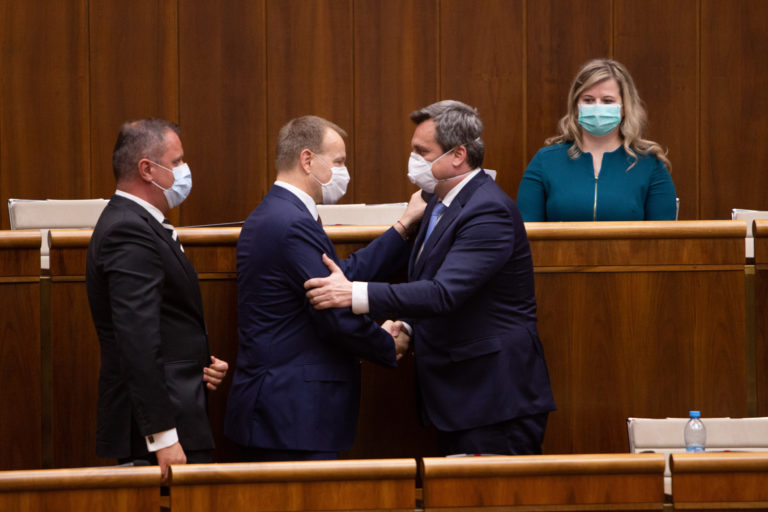 Končiaci predseda parlamentu Andrej Danko (uprostred vpravo) a novozvolený predseda parlamentu Boris Kollár (uprostred vľavo) počas rokovania ustanovujúcej schôdze NR SR. Bratislava, 20. marec 2020. Foto: SITA/NR SR