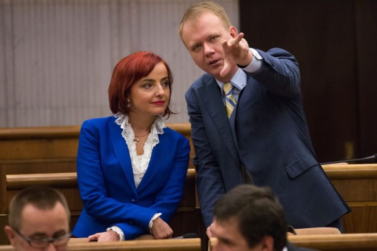 Poslanci NR SR Miroslav Beblavý a Katarína Macháčková počas ustanovujúcej schôdze NR SR pre VII. volebného obdobia . Bratislava, 23. marec 2016. Foto: SITA/Marko Erd