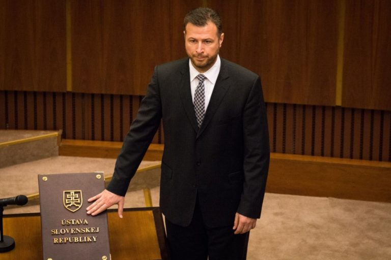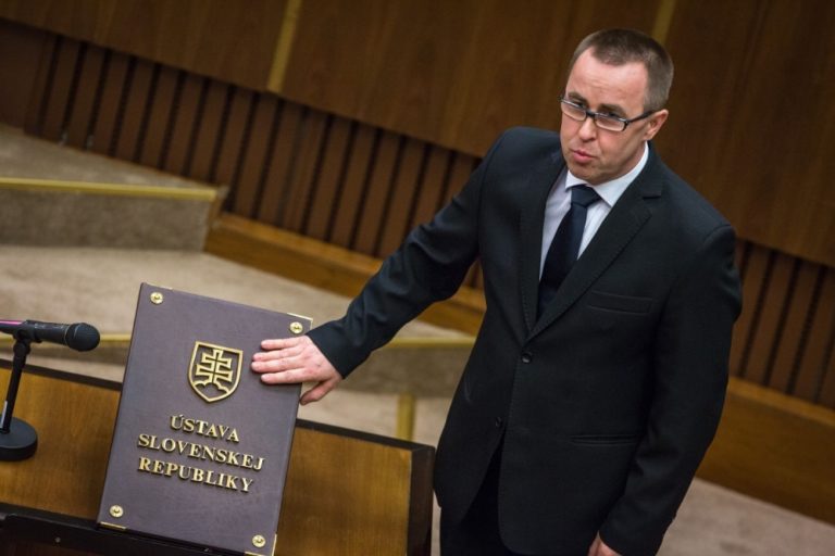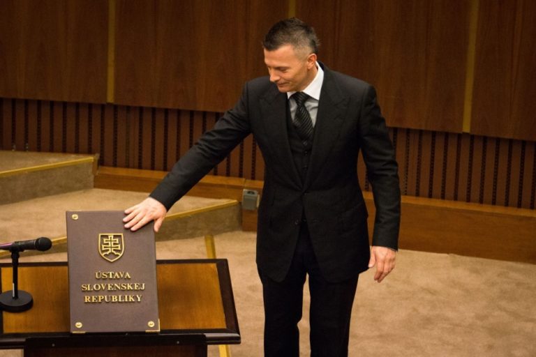 Poslanec NR SR Milan Krajniak za stranu Sme rodina skladá poslanecký sľub počas ustanovujúcej schôdze NR SR - VII. volebného obdobia. Bratislava, 23. marec 2016. Foto: SITA/Marek Mrviš