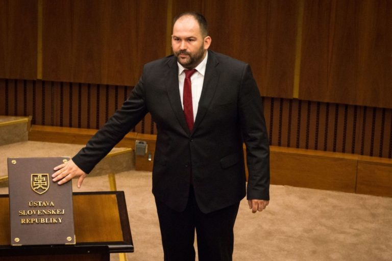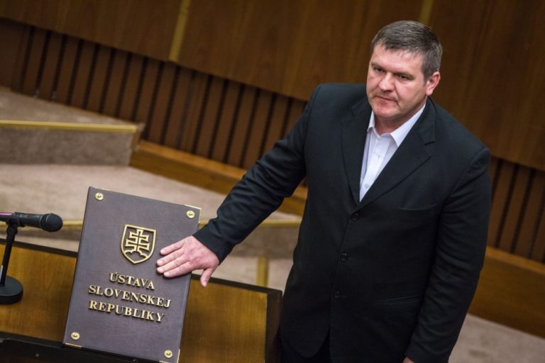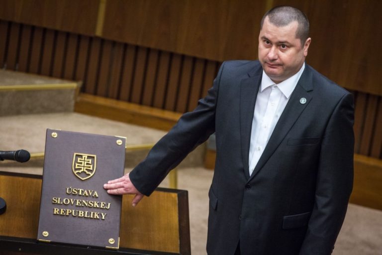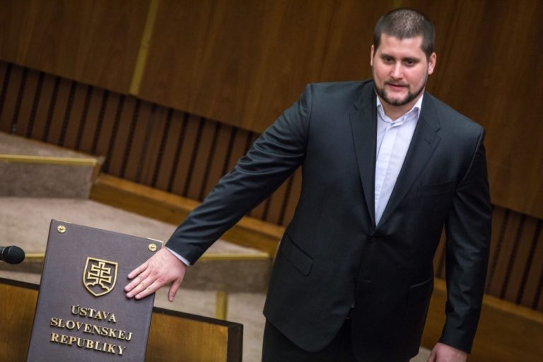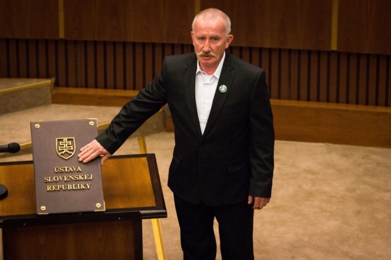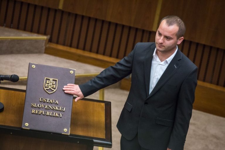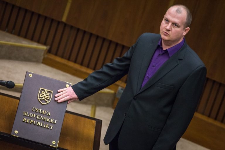 Poslanec NR SR Juraj Kolesár za stranu ĽSNS skladá poslanecký sľub počas ustanovujúcej schôdze NR SR - VII. volebného obdobia. Bratislava, 23. marec 2016. Foto: SITA/Marko Erd