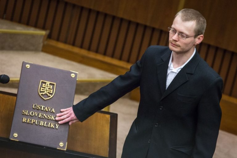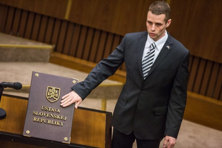 Poslanec NR SR Ondrej Binder za stranu ĽSNS skladá poslanecký sľub počas ustanovujúcej schôdze NR SR - VII. volebného obdobia. Bratislava, 23. marec 2016. Foto: SITA/Marko Erd