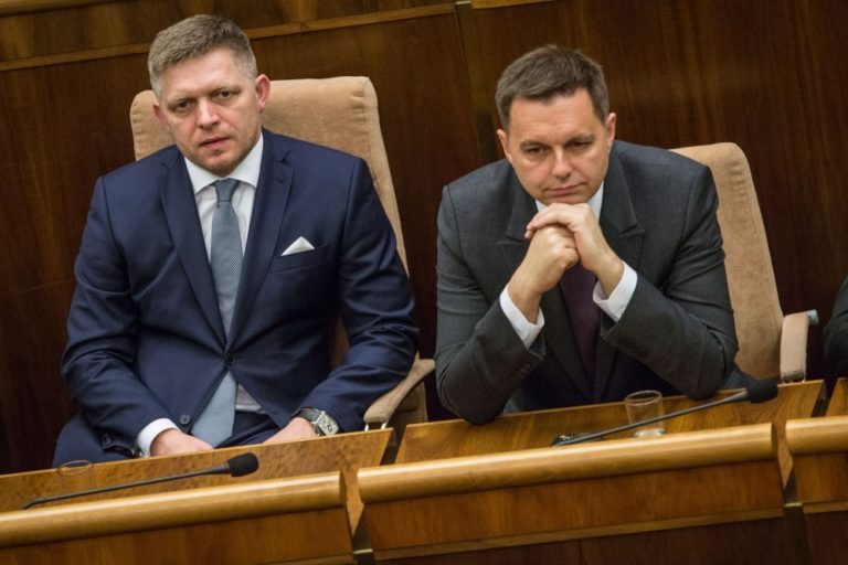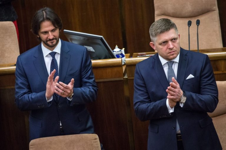 Sprava: Predseda vlády SR Robert Fico a minister vnútra Robert Kaliňák počas ustanovujúcej schôdze NR SR - VII. volebného obdobia. Bratislava, 23. marec 2016. Foto: SITA/Marko Erd