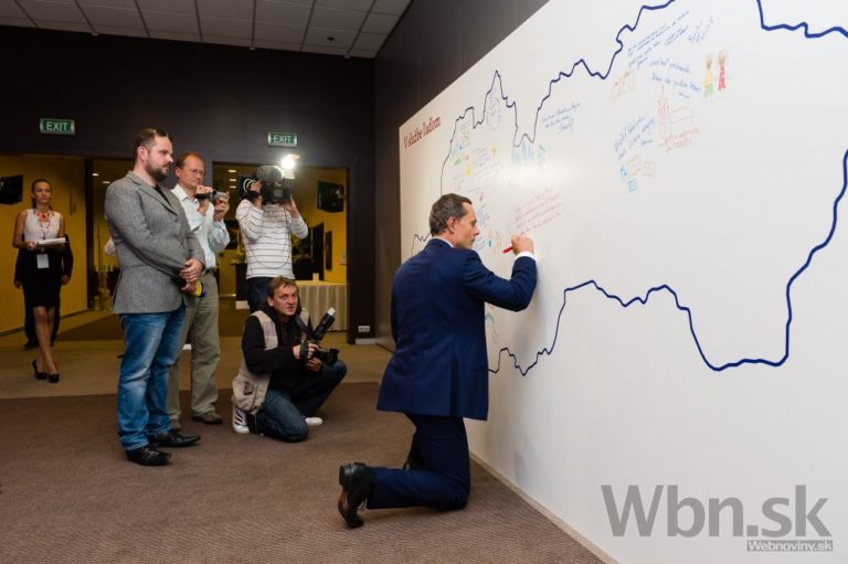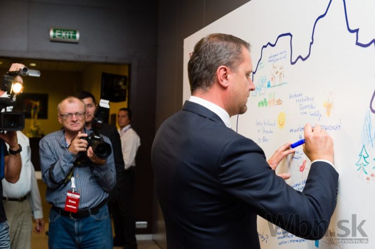 Primátor mesta Martin Andrej Hrnčiar píše posolstvo na mapu Slovenska počas ustanovujúceho snemu strany Sieť. Žilina, 1. september 2014. Foto: SITA/Milo Fabian