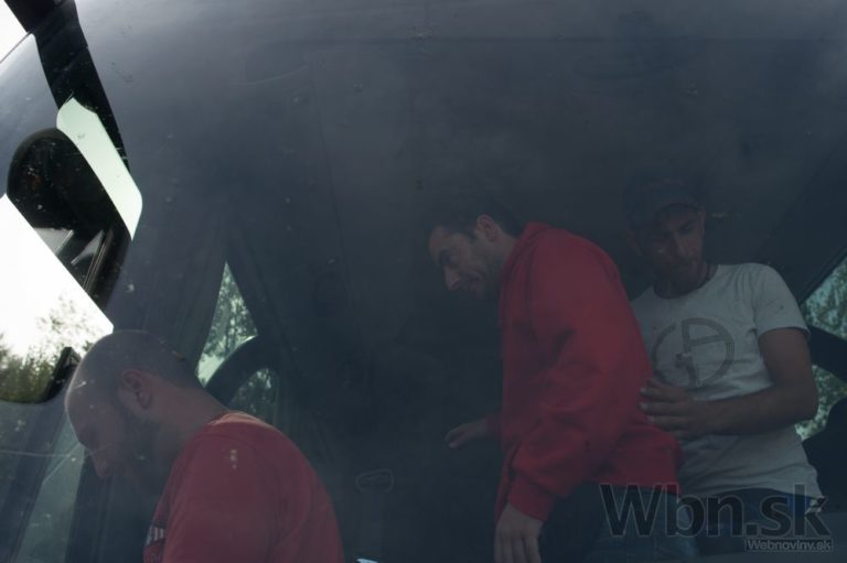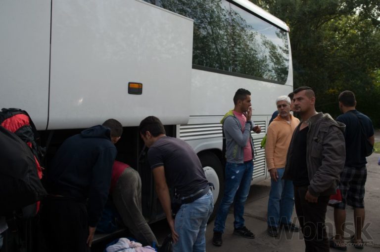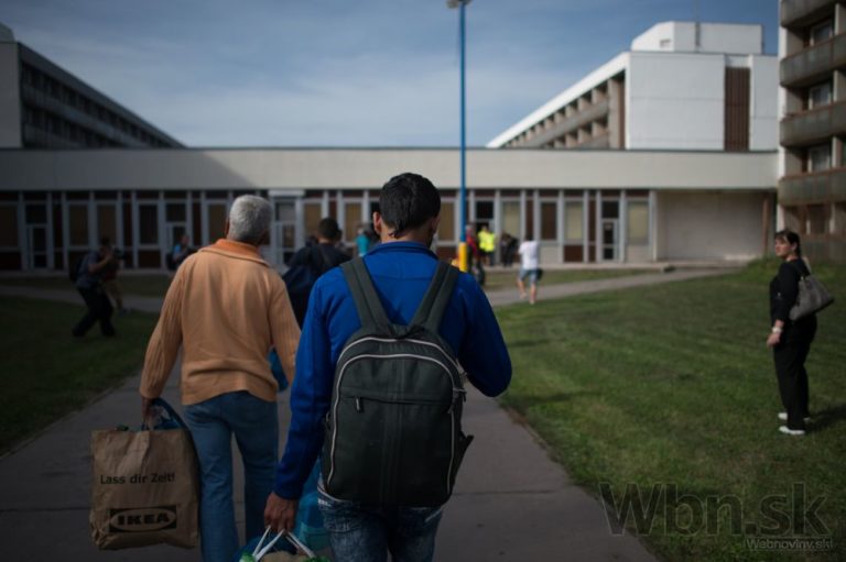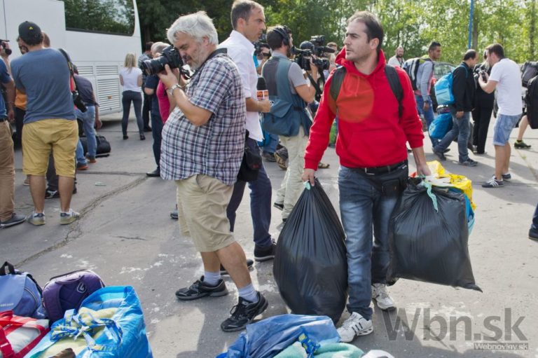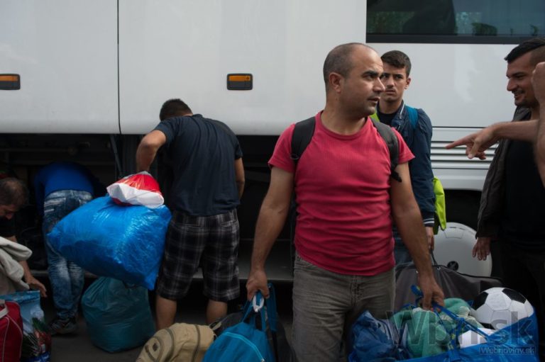 Príchod prvých utečencov (uprostred vpravo a v pozadí) z rakúskeho Salzburgu do azylového domu v Gabčíkove. Žiadatelia o rakúsky azyl budú na Slovensku dočasne, po skončení procesu sa vrátia späť do Rakúska. Gabčíkovo, 17. september 2015. Foto: SITA/Robert Tappert
