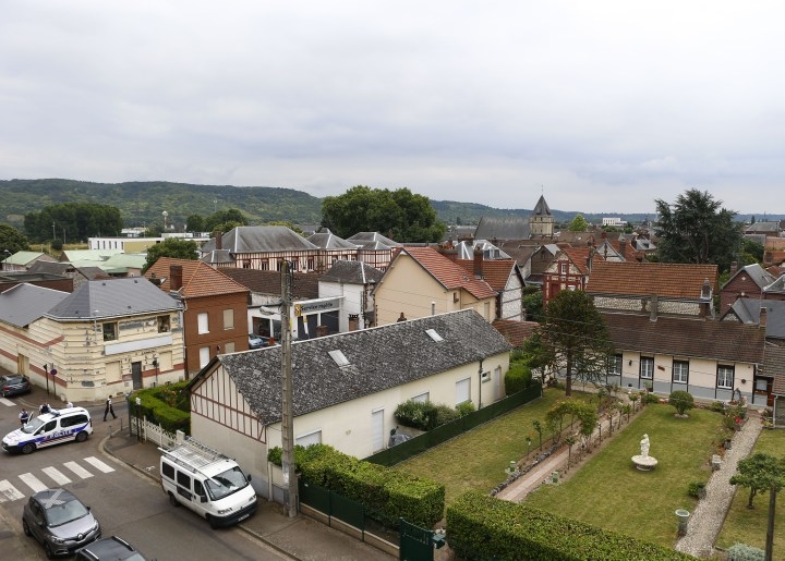 V kostole vo francúzskom meste Saint-Etienne-du-Rouvray dvaja útočníci ozbrojení nožmi zadržiavali viacero ľudí. Foto: SITA/AP