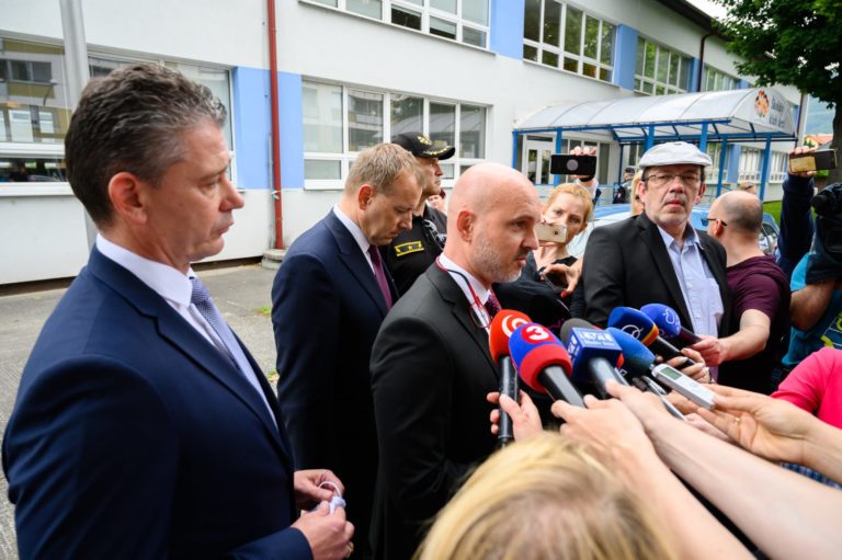 Minister školstva Branislav Gröhling (vľavo) počas brífingu pred budovou Spojenej školy J. C. Hronského vo Vrútkach, kde sa odohral tragický útok na žiakov a učiteľov základnej školy. Vrútky, 11. jún 2020. Foto: SITA/Milo Fabian
