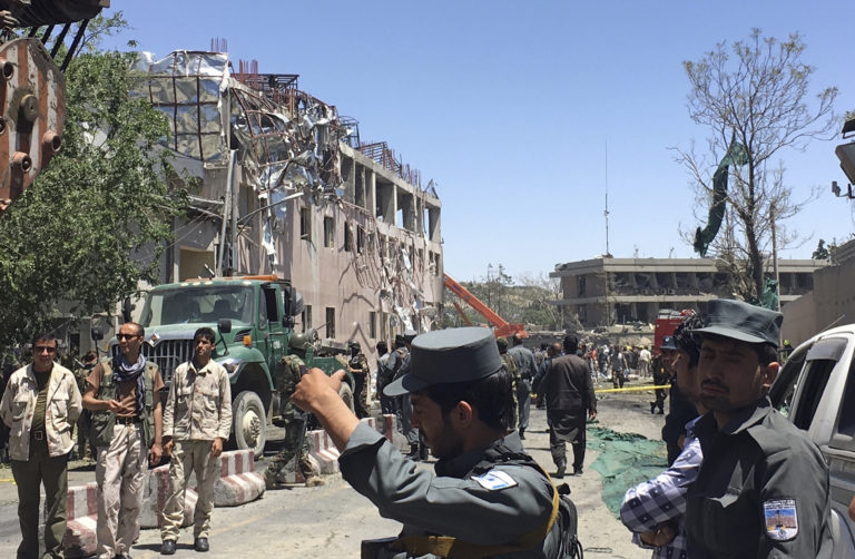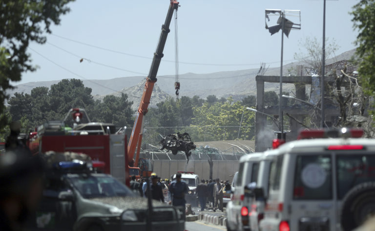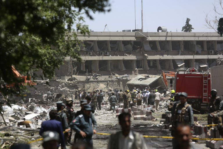 K útoku došlo na námestí Zanbak v centre mesta – v blízkosti prezidentského paláca, ministerstiev a zahraničných veľvyslanectiev. Výbuch zničil aj vyše 30 áut. Kábul, 31. mája 2017. Foto: SITA/AP