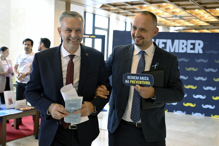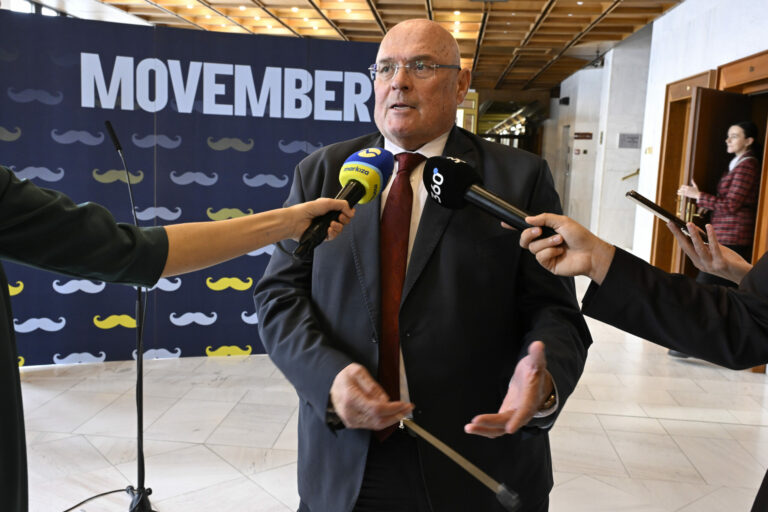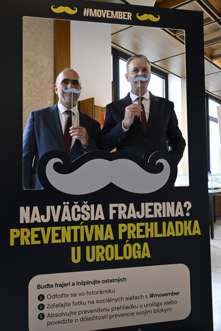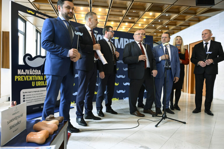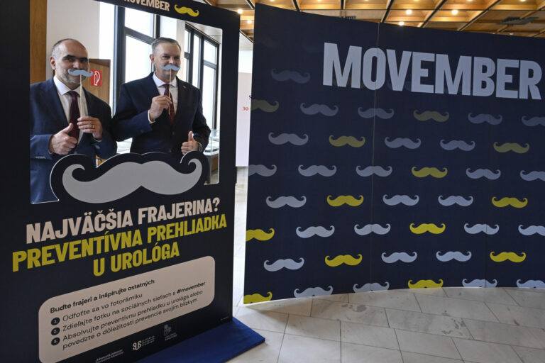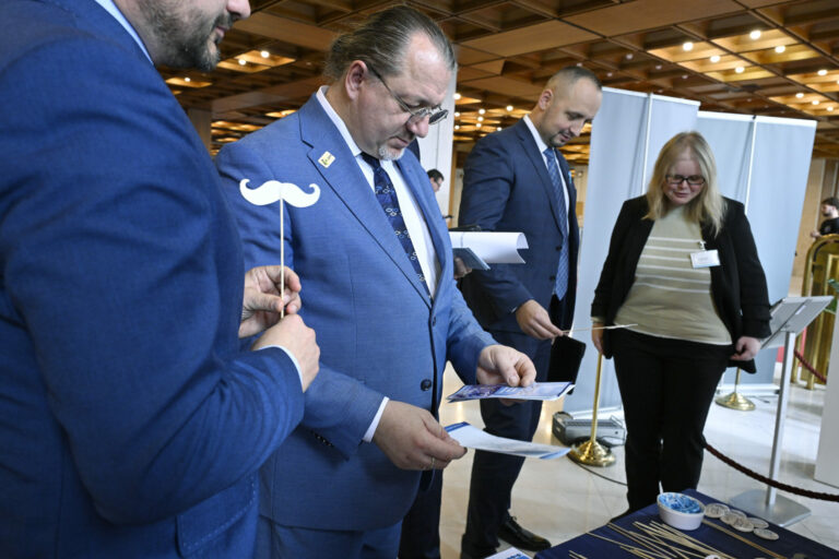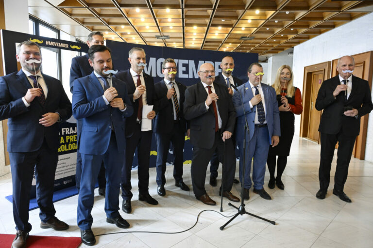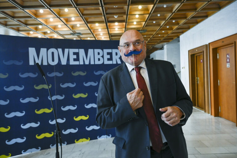 Predseda Výboru NR SR pre zdravotníctvo Vladimír Baláž počas symbolického uzatvorenia kampane Movember, pripomínajúcej dôležitosť prevencie proti rakovine prostaty a starostlivosti o zdravie mužov. Bratislava, 27. november 2024. Foto: SITA/Milan Illík