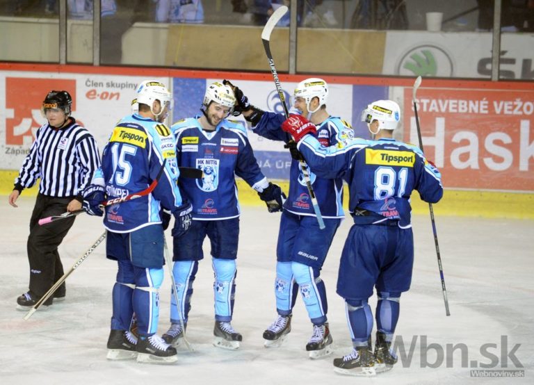 Zľava: Jozef Stümpel, Roman Tománek, Michal Novák a Erik Bednár z HK Nitra počas 14. kola slovenskej hokejovej Tipsport extraligy 2014/2015 medzi HK Nitra - HKM Zvolen. Nitra, 17. október 2014. Foto: SITA/Martin Havran