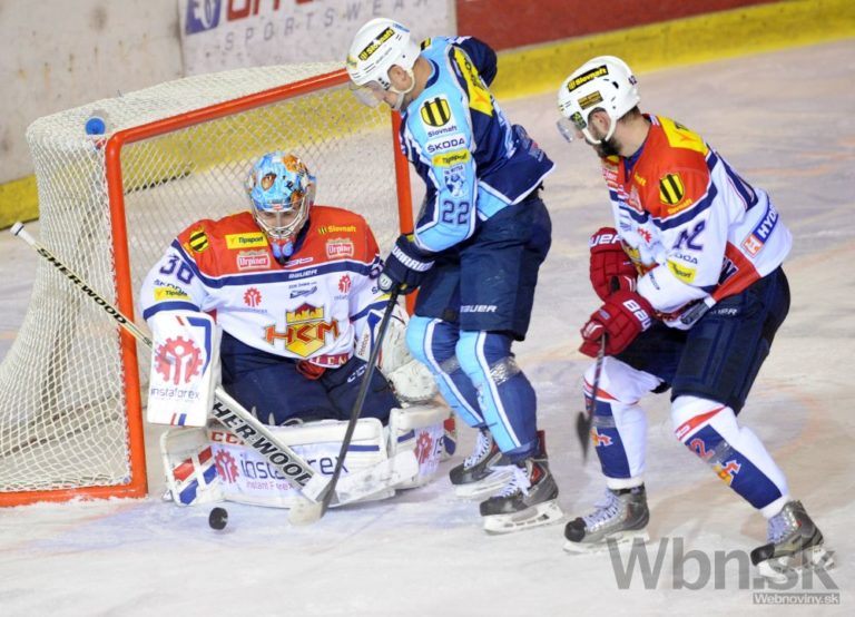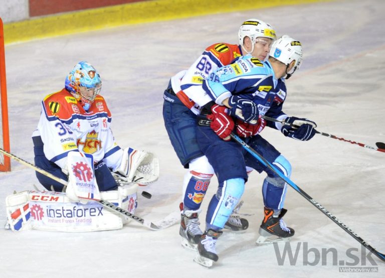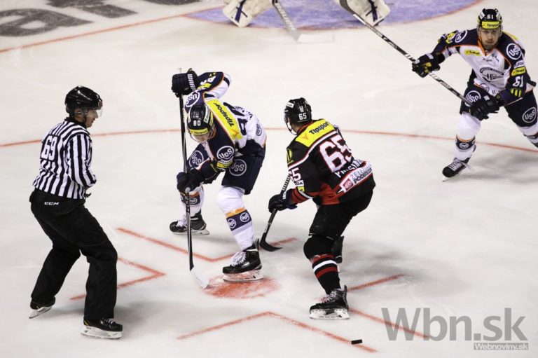 Miroslav Preisinger (uprostred vpravo) z HC'05 Banská Bystrica a Tomáš Hrnka (vľavo) z HC Košice počas 14. kola Tipsport extraligy medzi HC'05 Banská Bystrica - HC Košice. Banská Bystrica, 17. október 2014. Foto: SITA/Ján Viazanička