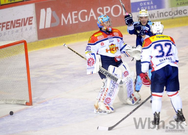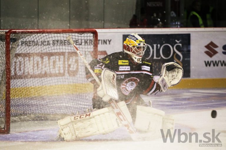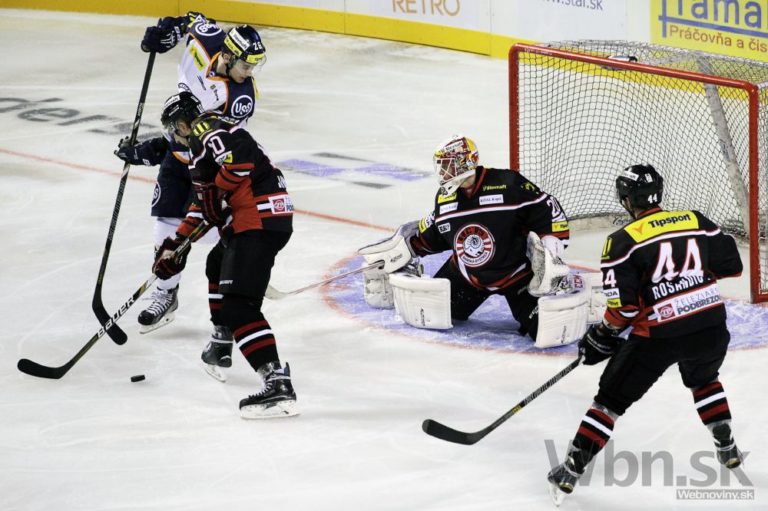 Brankár Miika Wiikman (druhý sprava) z HC'05 Banská Bystrica a Matúš Chovan (vľavo) z HC Košice počas 14. kola Tipsport extraligy medzi HC'05 Banská Bystrica - HC Košice. Banská Bystrica, 17. október 2014. Foto: SITA/Ján Viazanička